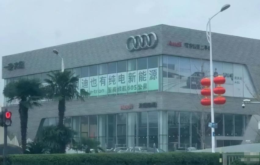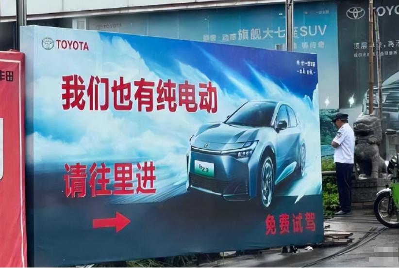 根據流傳在網上的照片,豐田的海報上寫著“我們也有純電動,請往里進”,海報展示了一輛豐田bZ3純電轎車,并標注了“免費試駕”的字樣。而奧迪的門頭海報也顯示了奧迪的純電動新能源車型。