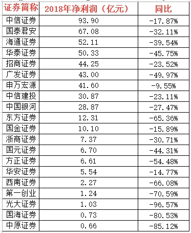 中信證券和國泰君安仍牢牢占據前二的位置。2018年,中信證券實現凈利潤93.9億元,同比下降17.87%,國泰君安實現凈利潤67.08億元,同比下滑32.11%;