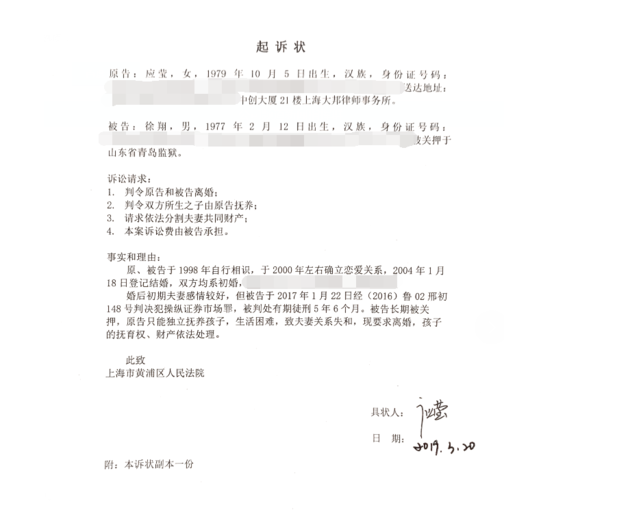 《離婚起訴狀》顯示,在徐翔被長(zhǎng)期關(guān)押之時(shí),應(yīng)瑩只能獨(dú)自撫養(yǎng)孩子,失去生活來(lái)源,以至于夫妻關(guān)系失和,故起訴離婚。