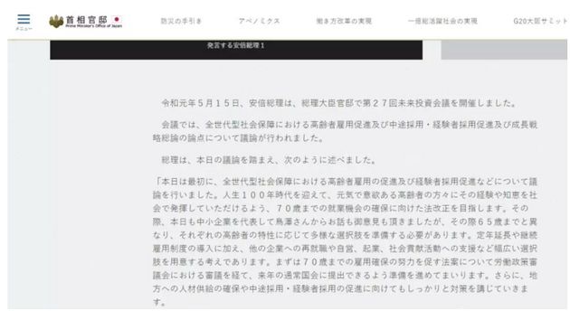 據日本首相官邸網站消息,在5月15日召開的未來投資會議上,日本政府發布了《高年齡者雇用安定法》修正案的概要(以下簡稱《修正案》),該《修正案》除了要求企業將退休年齡延長至70歲外,還要求企業支持老年員工到其他公司再就業、創業等等。