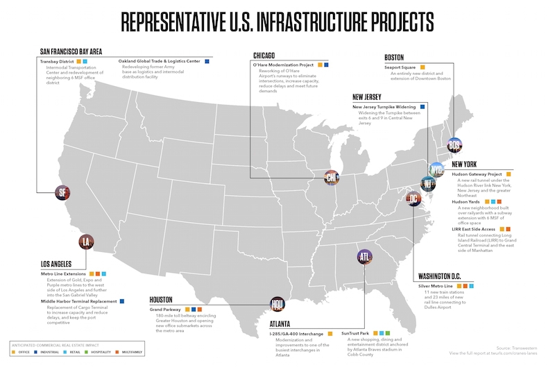 以交通為導向的項目為首的基礎設施投資正在推動美國許多大城市的經濟增長。美國土木工程師學會估計,到2020年,美國需要花費3.6萬億美元才能將該國的基礎設施恢復到足夠的水平。私營房地產公司Transwestern的一份新報告表明,投資基礎設施也可以有利于周邊商業房地產。該報告稱為“起重機和通道”,它確定了九個市場的主要基礎設施項目,并描述了項目如何影響 - 或者可能會影響 - 更大的建筑環境。