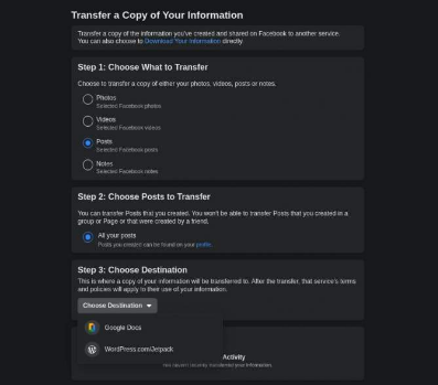 根據(jù)博客文章,F(xiàn)acebook用戶可以轉(zhuǎn)到其帳戶的“您的Facebook信息”設(shè)置以選擇“傳輸您的信息”。您可以選擇照片或便箋(但不能同時選擇兩者),然后將它們復(fù)制到Google文檔或WordPress。然后,將要求您在轉(zhuǎn)移開始之前登錄這些外部帳戶。