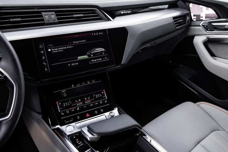 而內飾方面,奧迪e-tron別致的三屏設計,科技感滿滿。全車配有雷達、感應器、攝像頭、導航和互聯系統,通過偵測交通環境配合剎車和能量回收系統工作。 此外,e-tron還首次在量產車上實現了虛擬外后視鏡,可變換角度和焦距、可通過7英寸OLED屏幕清楚展現車身兩側影像。