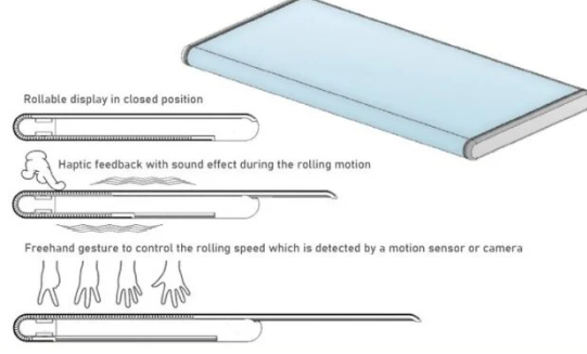 該專利概述了一種方法,允許用戶通過使用觸摸動作(或屏幕上的手勢)來操作這種滾動或擴展面板機制,華為將其稱為“徒手手勢控制”。為了控制可擴展顯示,屏幕上將顯示一個虛擬滑塊,讓用戶開始推出過程。該系統還將與觸覺反饋系統和聲音效果配對。此外,可卷曲智能手機對徒手手勢控制的支持將由攝像頭和/或運動傳感器提供支持。