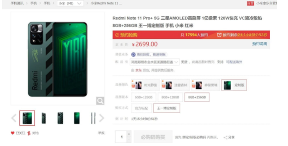 Redmi Note 11 Pro+ YIBO Design 限量版配備 8 GB RAM 和 256 GB 存儲空間。它的售價為 2,699 元(~422 美元)。具有相同 RAM 和存儲量的普通 Note 11 Pro+ 售價為 2,299 元人民幣(~359 美元)。
