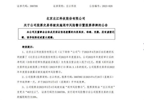根據(jù)深圳證券交易所創(chuàng)業(yè)板股票上市規(guī)則的規(guī)定,如果公司在上市以后在任何一年內(nèi),出現(xiàn)凈利潤(rùn)為負(fù)數(shù)或者應(yīng)收的額度未超過1億元人民幣的情況下,公司在深交所中的股票交易將會(huì)被提醒退市風(fēng)險(xiǎn)。針對(duì)于這種情況公司直到2023年的5月4日,依舊沒有做出任何改變,因此左江科技在深交所中的股票在5月4日以后被深交所實(shí)施了退市風(fēng)險(xiǎn)警示的相關(guān)處理流程,公司的股票也被掛上了*ST的標(biāo)識(shí),目前公司每天的股票漲幅度限制在20%之內(nèi)。