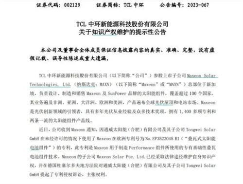 據TCL中環表示,Maxeon已經在100多個國家組裝這種組件,是業內安裝量最多的企業,旗下控股子公司環晟光伏有限公司和其子公司生產的該組件,是在中國境內唯一一個取得合法知識產權許可授權的制造商,通威太陽能制造該組件并未取得授權,所以針對此事,對通威太陽能及其下屬子公司提起訴訟。
