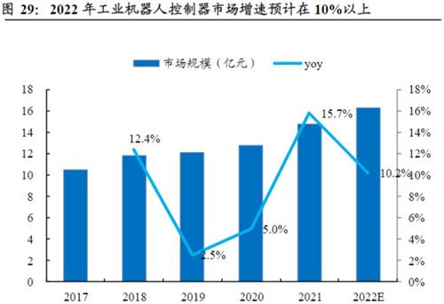 我國工業機器人控制器軟硬件的開發實力在如今已經得到了不斷增強的推動效果,需求量也日益提升,下游市場呈現飛速增長的趨勢,國內工業機器人的控制器市場規模。從2017年的10.5億元已經上升到2021年的14.7億元,預計在2022年,國內工業機器人控制器市場規模將會突破到16.2億元。