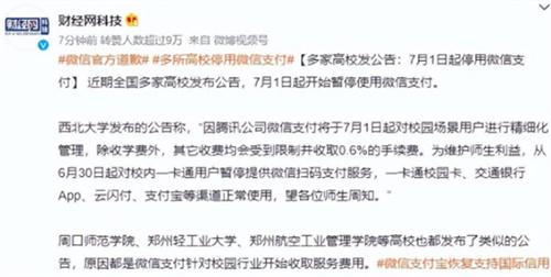 此前有多家高校發布公告稱,從7月1日開始暫停使用微信支付,主要的因素是微信從7月1日起將會調整校園場景的服務費率,騰訊方面做出的回應是,這一次的調整不會涉及學雜費和一些非盈利場景,對于校園盈利場景,包括部分電商還有旅館之類的行業,計劃費率會調整為百分0.2%,并非是網傳的0.6%費率,不過根據當前統計來看,目前已經有十所高校在官方途徑上宣布暫停使用微信支付。