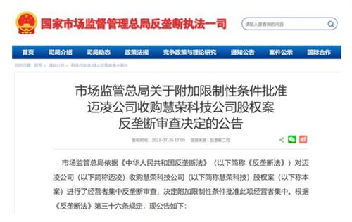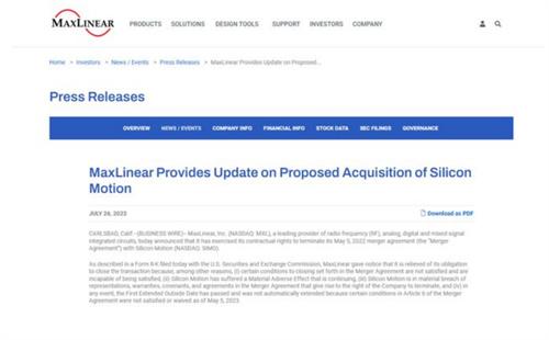 7月27日消息,美國寬帶通信芯片商邁凌科技發布通告稱,已經終止收匯慧榮科技的計劃,此次價值38億美元的潛在交易徹底終結。在過去的一年中,這一起交易已經走完了大部分的法律審核程序,最后一道程序是中國市場的反壟斷審核,這一審核在7月26日的晚上,已經由國家市場監管總局正式通過,批準了美國邁凌公司收購慧榮科技公司的計劃。
