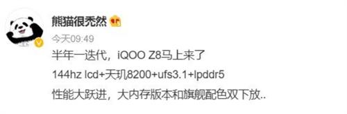 7月9日,有數碼博主在微博上爆料iQOO Z8新機,最新的這款機型據說會采用天璣8200處理器,并且內存規格將會回歸至LPDDR5+UFS3.1,能夠給用戶帶來更快速的內存處理效果。除此之外,Z8還會選擇LCD屏幕,刷新率將會從前代的120赫茲提升到144赫茲,這一消息在全網傳開后瞬間引起很多手機發燒友的關注,這款手機的上市或許能夠成為新一代可以挑戰紅米的機型。