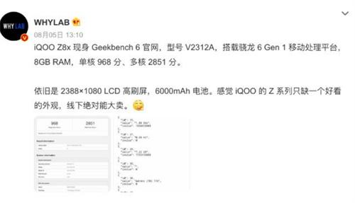 如今,iQOO Z8X已經現身Geek bench6的官網,8 GB的運行內存,單核跑分達到968分,多和跑分達到2851分,屏幕的刷新率仍舊是采用120赫茲的高刷屏,不過電池容量相比于正常版本更高一些,達到了6000毫安的容量。不過這一系列機型受人詬病的仍舊是外觀方面的設計,如果在外觀方面擁有一些改變,上市之后一定能夠獲得大賣。