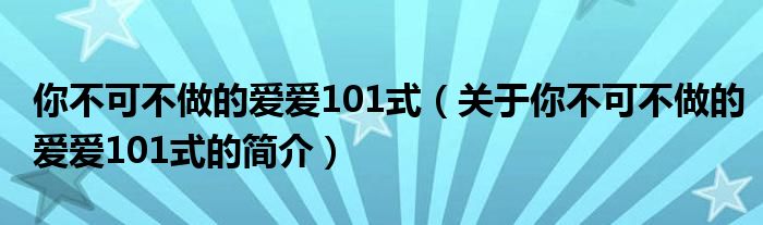 大家好,你不可不做的愛愛101式,關(guān)于你不可不做的愛愛101式的簡介很多人還不知道,現(xiàn)在讓我們一起來看看吧!