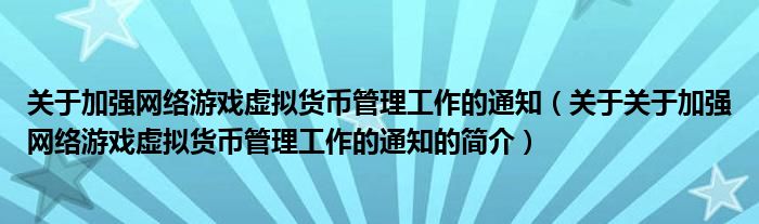 本文關(guān)于關(guān)于加強(qiáng)網(wǎng)絡(luò)游戲虛擬貨幣管理工作的通知的簡介就講解完畢,希望對大家有所幫助。