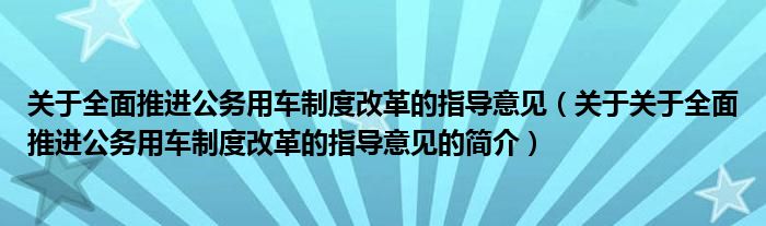 大家好,關于全面推進公務用車制度改革的指導意見,關于關于全面推進公務用車制度改革的指導意見的簡介很多人還不知道,現在讓我們一起來看看吧!