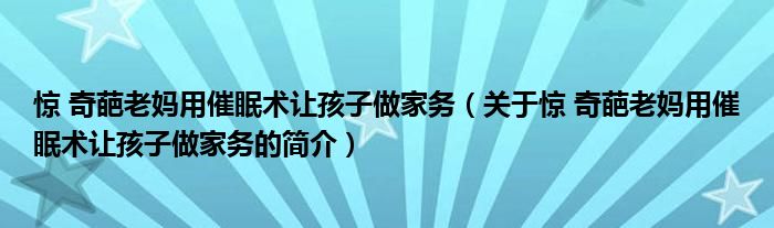 大家好,驚 奇葩老媽用催眠術讓孩子做家務,關于驚 奇葩老媽用催眠術讓孩子做家務的簡介很多人還不知道,現在讓我們一起來看看吧!