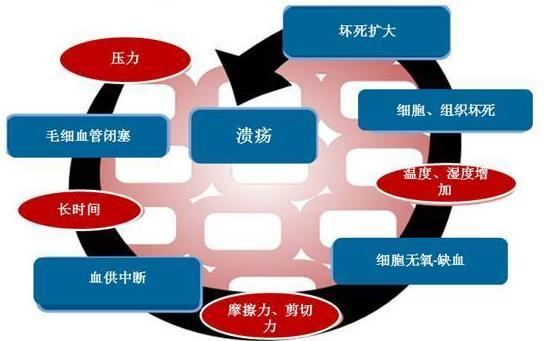 壓瘡發生的原因包括多個方面,最常見的是皮膚長期受到垂直壓力或剪切力和摩擦力而引起的,還有一些疾病的原因,也很容易導致患者出現壓瘡,比如下肢骨折,癱瘓,皮膚潮濕,營養不良,或感覺出現障礙等原因,一些器械性的損傷也會導致患者出現壓瘡,比如骨折之后打了石膏或者是氣管插管,還有長期佩戴呼吸機面罩等原因。