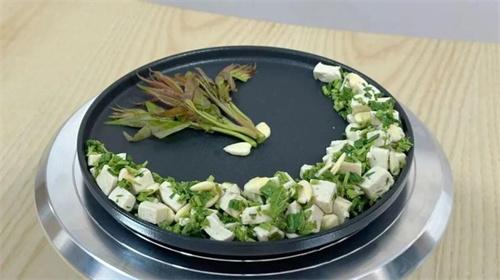 第5步,將攪拌好的香椿豆腐盛入相應的容器中,擺盤上桌。