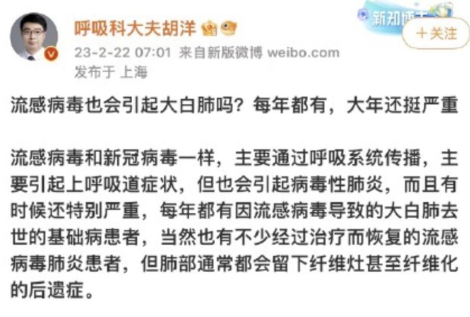 目前感染甲流后的大部分患者都是輕癥病例,但值得注意的是流感也是會引起“白肺”的,甲流病毒可能會導致流感病毒肺炎,所以免疫力低下、老年人、患有基礎病的人一定要格外注意,癥狀嚴重一定要及時就醫。