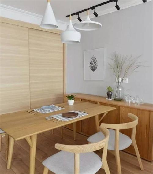 2. 餐廳。玄關的正對面就是餐廳,由于空間并不是很大,而且正好與廚房是對著采用了比較不錯的動線設計。選擇了原木的家具作為裝飾,在背景墻上放置了一個收納柜。