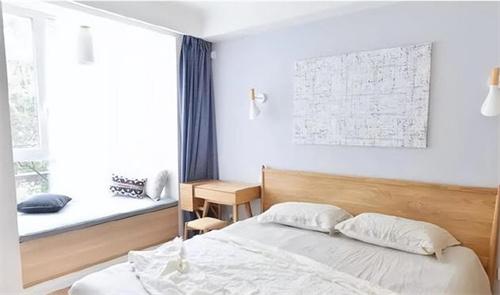 4. 臥室。臥室中有一個比較大的飄窗,能夠使室內的采光更好。臥室中的家具和床都是采用的原木材料,比較強的北歐混搭風非常好看,也顯得溫馨舒適。在床的旁邊添加一個比較小的梳妝臺,既可以把臥室當成休息區,也可以當成辦公區。