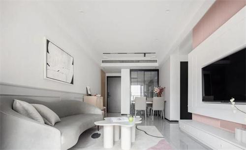 2. 客廳采用的是白色為主,搭配了一些粉色,地板采用的是淺灰色。這樣使得客廳顯得既大氣又時尚。電視背景墻做了一個比較簡單的造型設計,既簡單又好看。沙發背景墻的下半部分做了一個簡單的造型作為裝飾,上半墻保留了原有的白色,采用的是乳膠漆,給人帶來干凈清新的感覺,掛上一幅簡單的畫。