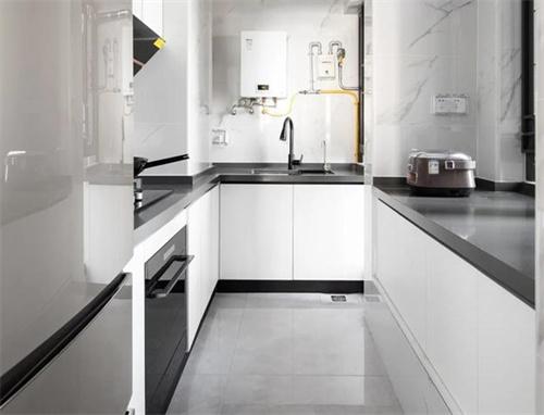 3. 廚房擁有比較好的采光,采用的是灰色的瓷磚,墻上則采用了大理石紋,臺面采用的是黑色,再搭配白色的柜門,非常的鮮明好看,既簡約又大氣。