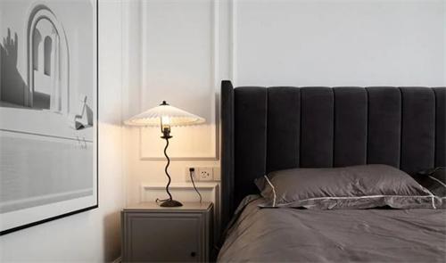 4. 主臥室的背景墻采用石膏線做了一個背景的裝飾,能夠給人一種輕奢感。再加上黑色的床,灰色的五件套以及臺燈掛畫作為裝飾,整體給人帶來輕奢的感覺。