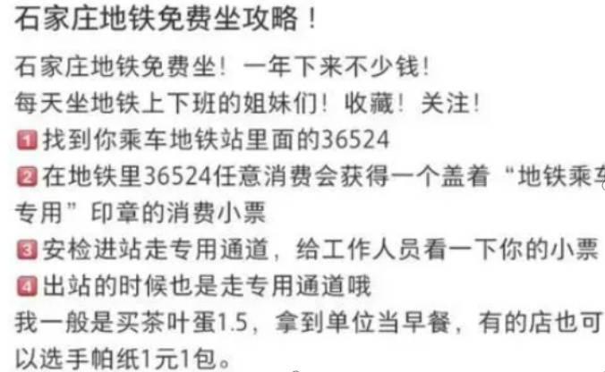 還有網友在社交平臺上發布了一則石家莊免費乘地鐵的攻略,首先在進入地鐵站之后要找到地鐵站內開設的36524的便利店,在店內購買任意商品都會獲得一張小票,可以去買一根火腿腸也可以去買一瓶礦泉水,或者是一包手帕紙,一元錢也可以是一個1.5元的茶葉蛋,結算之后在小票的背面會有一個地鐵乘車專用的紅章在進出站可以走人工專用通道就可以實現免費乘坐地鐵,也有一些細心的網友在底下評論到,如果在36524便利店購買了幾樣商品也可以單獨分開結算,這樣就可以獲得多張小票在當天就可以擁有多次免費乘坐地鐵的機會。