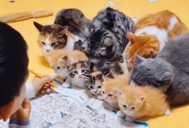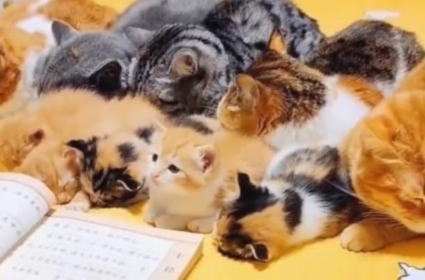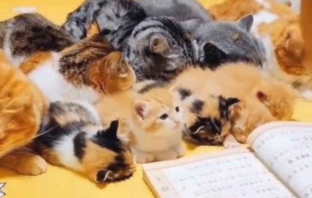 就在這個小男孩給貓咪上課的過程中,沒多大會兒小毛筆全部倒作一團,看著可愛極了,像極了,和大家小時候在聽課時候的狀態,被網友戲稱原來上課打瞌睡的不只是人,貓咪也會。從視頻中能夠看出這些貓咪剛開始還都站著聽課,直到后來全部都趴下來,之后基本全軍覆沒,慢慢的都閉上了眼睛睡著了,像極了我們小時候的樣子。