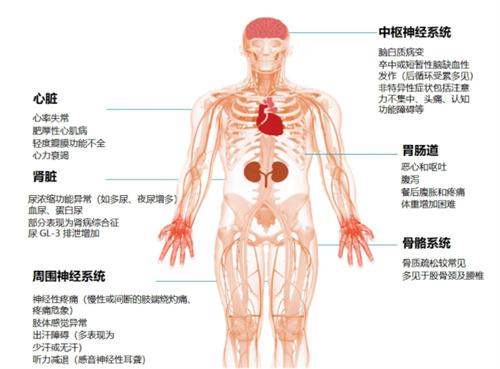主要的堆積部位在人體的血管、神經(jīng)、腎臟、心臟等多個組織器官引起了這些組織器官的功能性障礙,才會導(dǎo)致癥狀的發(fā)生。法布里病主要分為了經(jīng)典型和遲發(fā)型兩種,由于臨床表現(xiàn)的不同,這種疾病并沒有特殊的異性,在臨床上非常容易造成漏診和誤診,有疾病從患者出現(xiàn)癥狀到確診。一般都時間相對比較長,平均間隔年限達(dá)到了14.8年。
