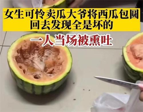 在3月27日河南駐馬店陸同學和自己的室友周末逛街時發現有兩位年齡非常大的大爺在路邊賣西瓜,當時兩人還都戴著安全帽,身上也非常的臟屬于同情心陸同學和自己的室友,就將兩位大爺剩下的5個西瓜全部都買走了,在購買西瓜時兩位大爺還承諾,如果西瓜沒有熟或者有壞的包退包賠,令人沒想到的是幾名同學回到宿舍之后切開一個西瓜,發現已經壞了,接連將5個西瓜全部切開之后,發現5個瓜全是壞的,陸同學和室友返回去找賣瓜的兩位老人時已經不知所蹤。