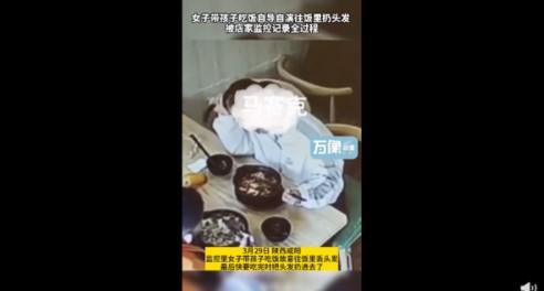 近日在陜西咸陽,一個女子帶孩子吃飯時,故意在菜里扔頭發,而這個過程全部都被店中的監控拍攝了下來,從視頻中看到這個女子在最后快吃完的時候,將頭發扔進了飯菜里面,女子先是摸了摸自己的頭發,然后東張西望了一番之后將頭發扔進了飯菜里面,端著碗就去找了店家要求賠償,由于當時店里比較忙,所以店家就將錢退給了這個女子,在事后店家查了一下監控,才發現這個女子是故意人的頭發。