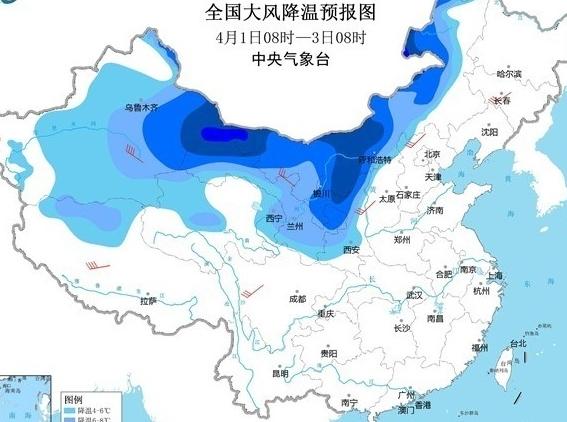 這股強冷空氣之后會繼續(xù)向東南方向移動,對大部分地區(qū)都會造成影響,根據(jù)氣象臺預(yù)測,在4月1日8:00~1:00時,新疆內(nèi)蒙古大部分地區(qū),和青海西北部東部甘肅、寧夏,陜西,中部和北部、黑龍江西北部等地區(qū)氣溫將會下降4~8度,新疆東部中部內(nèi)蒙古中部的地區(qū)溫度將會下降超過10度,在氣溫下降的同時,大部分地區(qū)都會伴隨著5~6級偏北風(fēng)。