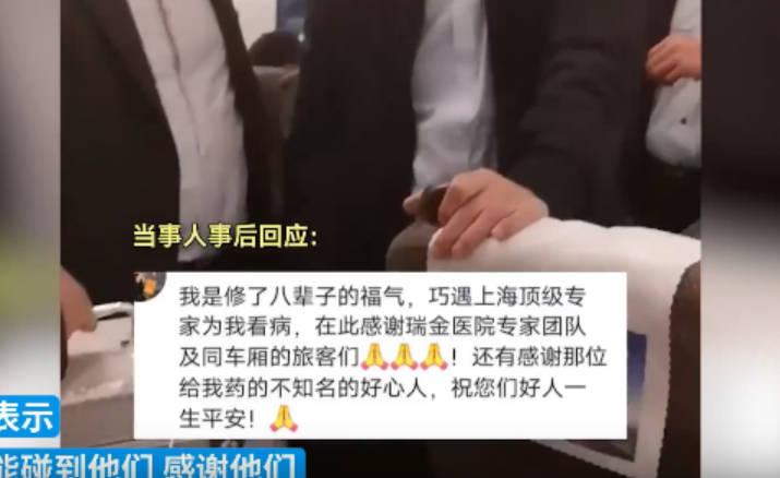 當事人徐女士表示,這次真是八輩子修來的福氣,正好遇到了上海頂級專家為自己看病,感謝這些專家,同時還要感謝那一個不知道名字的好心人給自己送來的藥物,同時祝所有好心人一生平安,徐女士表示,當時自己就是感覺頭暈,身體極為不適,正好在自己車廂的隔壁,就是專家團隊。