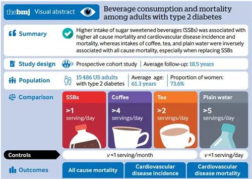 這次的科學研究針對了15,486名二型糖尿病患者,這些患者在日常生活中飲料的攝入量,其中就包括了含糖飲料,人工糖,飲料,果汁,咖啡茶以及全脂牛奶和白開水。通過分析表明,對于特定型的飲料攝入量和二型糖尿病患者的死亡率以及心腦血管疾病的發病率有著比較直接的關系,這項研究一共持續了18年,記錄到了3447名參加實驗的患者患心腦血管疾病,有7638名糖尿病患者死亡。