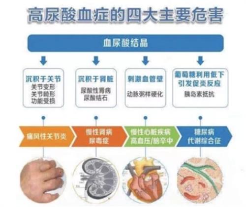 尿酸作為一種嘌呤物質(zhì)在體內(nèi)的代謝物,如果人體內(nèi)的嘌呤指數(shù)過高,就會使得人體內(nèi)尿酸的含量也會越來越高,人類最多可以容納1200毫克的尿酸,而這些尿酸都需要腎臟和腸道來進行清理和排除體外,如果體內(nèi)的尿酸過高,不能夠及時的排出體外,就會產(chǎn)生尿酸鹽的晶體,這些晶體會沉積在關(guān)節(jié)的周圍或者腎臟中,導(dǎo)致痛風(fēng)性關(guān)節(jié)炎的發(fā)生,還能夠引起關(guān)節(jié)的炎癥。