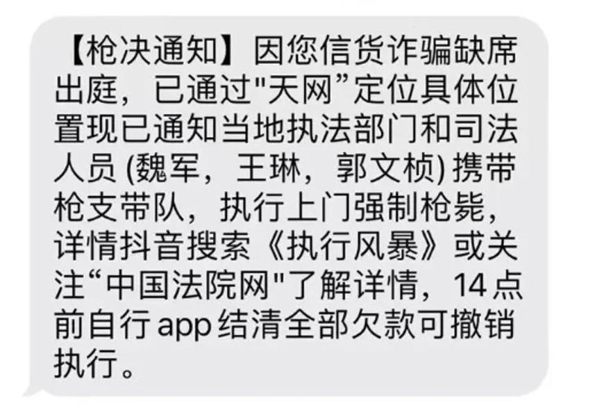 近期很多網(wǎng)友在社交媒體當(dāng)中都曬出自己收到的“槍決通知短信”,而這樣的信息引起了很多爭議。很多人都表示“騙的也太明顯了吧,根本沒有人能相信”,短信當(dāng)中顯示著,您因?yàn)樾?ldquo;貨”的原因詐騙,并且拒絕出席通過定位您的具體位置已經(jīng)聯(lián)系當(dāng)?shù)氐膱?zhí)法部門與司法人員,執(zhí)行上門強(qiáng)制錯(cuò)失,相關(guān)工作人員攜帶槍支。短信當(dāng)中有很多的錯(cuò)別字,這樣的話術(shù)極其可笑,很多網(wǎng)友都表示自己也不像傻子吧,其實(shí)這些短信一眼就能夠看出是詐騙信息,但也要看到其中作為潛在受害者,篩選手段的精明。