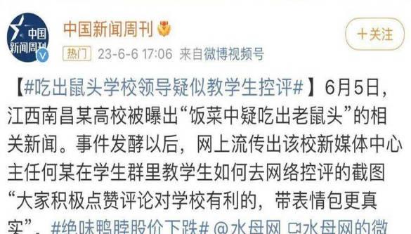 導讀 在近期江西南昌有一個高校的學生發布了一則視頻,說在食堂的飯菜當中有異物,整個樣子疑似老鼠頭,結果學校對于這一則視頻當中的現象否認,表示食物這一個異物是鴨脖,于是雙方就在輿論當中展開了強烈的拉鋸戰。