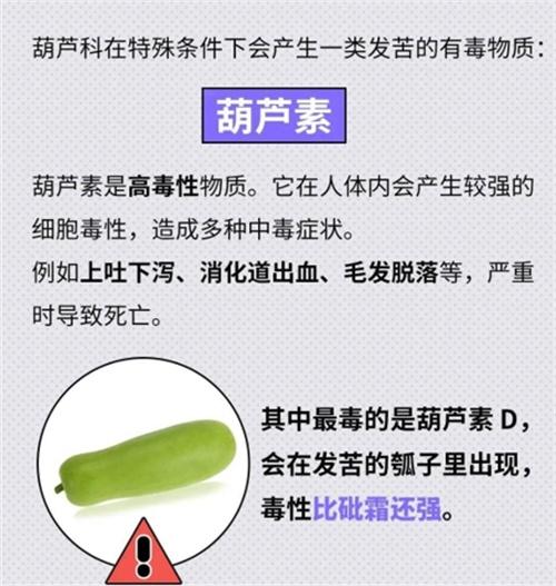西葫蘆營養價值方面很高,但是葫蘆瓜是西葫蘆的同一宗,本身營養價值并不高,苦葫蘆的瓜和瓜蒂,都含有過量的葫蘆素-葫蘆甙,應當仔細甄別這兩種種類,這種植物類毒素盡管加熱之后仍然會留下。人類誤食30分左右就會有相關中毒癥狀的出現,輕度的話會有腹痛、惡心、嘔吐、腹瀉的癥狀,較為嚴重的患者在肝腎功能上會有損傷,一旦誤食了苦葫蘆瓜的話,應該馬上前往醫院。