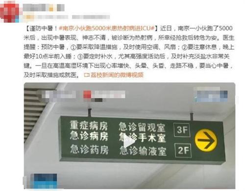 今日在南京 有一個小伙跑完5千米之后,突然出現神這么輕以及中暑的相關表現,最終被診斷成為熱射病,在經過搶救之后,最終脫離了危險。醫生提醒,在高溫高濕的環境之下,如果有頭暈頭昏,心率增快等眾多的現象,要當心中暑,只是采取相關的措施或者前往就醫。