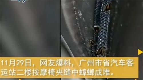 6月10日廣東廣州有一男子發布視頻,本來是坐在廣州南站放置的按摩椅上,突然覺得身體發癢,起身查看之后發現按摩椅上有蟲子出現。6月11日廣州南站的工作組人員也表示,目前火車站也將按摩椅不干凈這個情況,向有關負責人反映。