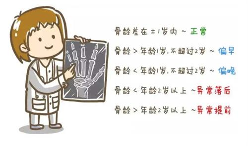 孩子在生長發育過程中受到性別,環境和營養攝入等方面的問題,會讓骨齡發生一些變化,從而與年齡出現一些偏差,這種情況被稱作為骨齡差,一般來說,骨齡差控制在正負一歲左右是允許的,也是被看作為正常發育。如果骨齡大于實際年齡一歲以上沒超過兩歲,可以看成早熟,如果超過了兩歲那么就是屬于異常提前發育,如果低于一歲屬于偏晚發育,低于兩歲或以上那么就屬于落后發育了,要及時前往醫院就醫處理。