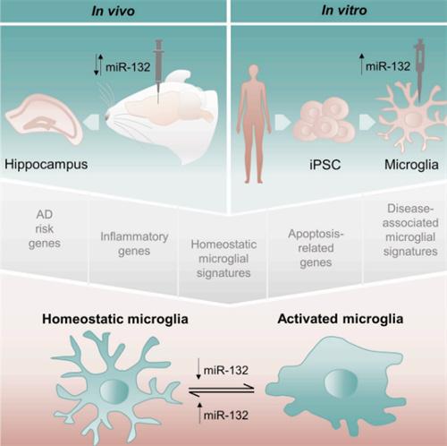 為了進一步將miRNA-132產生的作用確認,作者認為對于小鼠體內的miRNA-132水平做出了操控,同時對于大腦中不同細胞的類型不斷收集,做出了RNA方面的測試序列。根據具體的分析,能夠看到miRNA-132在小膠質細胞中有著極為關鍵的作用,這種細胞是大腦當中有免疫功能支持的細胞種類,因此可以有效決定,神經系統方面存在炎癥的水平,并且miRNA-132在水平上越低的情況之下,小膠質細胞所擁有的炎癥水平會更高。