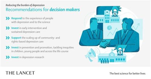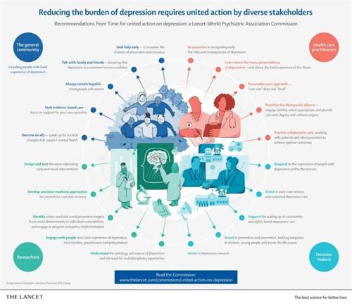 2022年柳葉刀發表了《世界精神病學協會抑郁癥重大報告:對抑郁癥采取聯合行動的時候到了》,抑郁癥是在全球范圍內能夠避免的一種過早死亡和痛苦死亡主要的原因之一,在全球范圍內,抑郁癥危機沒有得到解決且日益嚴重,對于醫療服務者,政府研究人員以及抑郁癥患者的家屬作出呼吁,努力提高對抑郁癥的認知。