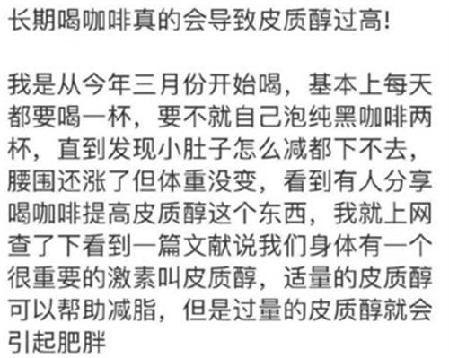 近期“長期喝咖啡會使得皮質醇過高”這一消息登上了微博熱搜,王女士表示從3月份開始每天至少會喝一杯咖啡,到現在為止小肚子減不下去了。解放軍總醫院第八醫學中心營養科主任左小霞,表示長期喝咖啡確實很可能會導致皮質醇升高,但是這也有多種因素決定。