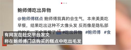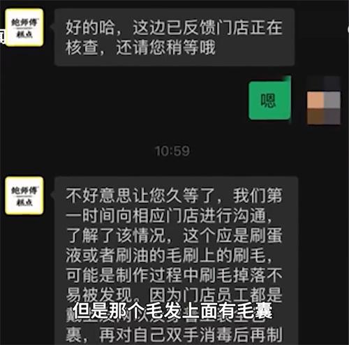 馬女士稱最開始店家說按照原價會賠償,當(dāng)被馬女士拒絕之后又稱以三倍價格賠償,在被自己拒絕之后就表示可以找食品相關(guān)的部門進(jìn)行投訴,感覺鮑師傅門店對于食品安全問題過于忽視。在詢問客服時,客服稱整個鮑師傅的后廚是全透明的,工作人員在制作過程中都會戴著頭套鞋套和顧客已經(jīng)在商量賠償事宜了,這個是刷蛋液的羊毛刷上所掉落下來的。這件事情也引起了對于食品安全的再次重視,客服人員這一回復(fù)也顯得有些牽強。