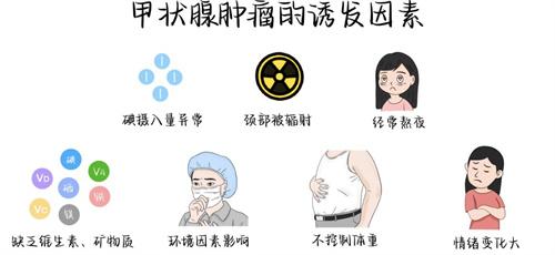 事實上,甲狀腺癌患病的原因并沒有非常的明顯,生活當中可能存在很多不良因素會誘發甲狀腺癌的產生,需要盡量避免這些因素,目前可能認為生活當中的誘因主要有以下幾種類型: