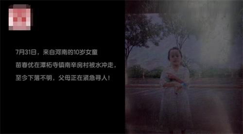 北京時(shí)間的7月31日,一名從河南省來到北京探望親近的10歲女童,在探親的過程中遭遇了洪水,被洪水沖走之后的這個(gè)小女孩便下落不明,而現(xiàn)在時(shí)間也已經(jīng)超過了72小時(shí),這名走丟的小女孩名字叫做苗春優(yōu),小女孩父母向記者表示,他們家三口人當(dāng)時(shí)住在門頭溝區(qū)的潭拓寺鎮(zhèn)南辛房村,由于當(dāng)時(shí)門頭溝區(qū)遇到了洪水的襲擊,導(dǎo)致家里的房子被洪水沖垮,女兒也被這場(chǎng)洪水沖走了。