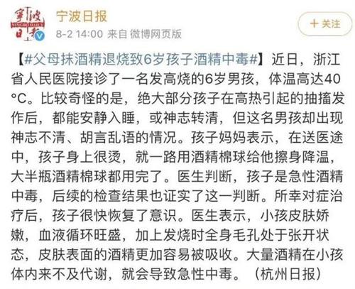 近期,在浙江省人民醫院收治的一名,發高燒導致抽搐的6歲男孩體溫甚至一度高達了40℃。然后醫生感覺很奇怪的是大部分孩子在出現高熱抽搐后,都可以較為安靜的入睡,或者神志變得清醒,但這名孩子卻胡言亂語神志不清,從母親口中得知,送醫過程中,因為孩子身上很燙,媽媽就用酒精棉球給孩子擦拭身體。